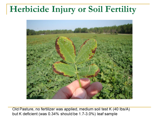 Herbicide Injury or Soil Fertility<BR>Old Pasture, no fertilizer was applied, medium soil test K (40 lbs/A)  <BR>but K deficient (was 0.34% should be 1.7-3.0%) leaf sample<BR>