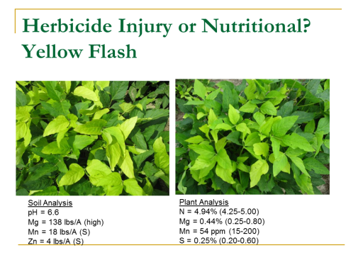 Herbicide Injury or Nutritional? Yellow Flash<BR>Soil Analysis <BR>pH = 6.6 <BR>Mg = 138 lbs/A (high) <BR>Mn = 18 lbs/A (S) <BR>Zn = 4 lbs/A (S)<BR>Plant Analysis <BR>N = 4.94% (4.25-5.00) <BR>Mg = 0.44% (0.25-0.80) <BR>Mn = 54 ppm (15-200) <BR>S = 0.25% (0.20-0.60)<BR>