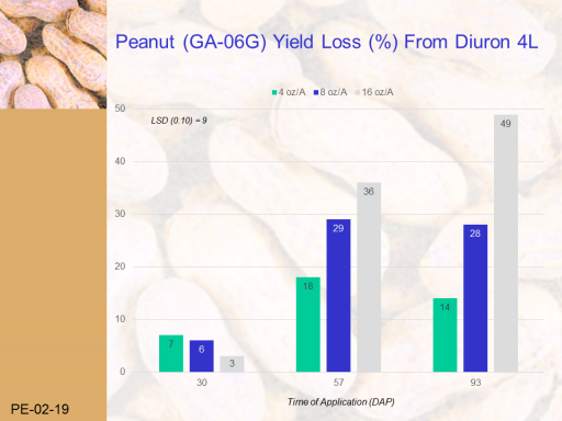 Peanut (GA-06G) Yield Loss (%) From Diuron 4L<BR>Time of Application (DAP)<BR>LSD (0.10) = 9<BR>PE-02-19<BR>