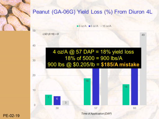 Peanut (GA-06G) Yield Loss (%) From Diuron 4L<BR>Time of Application (DAP)<BR>LSD (0.10) = 9<BR>PE-02-19<BR>4 oz/A @ 57 DAP = 18% yield loss <BR>18% of 5000 = 900 lbs/A <BR>900 lbs @ $0.205/lb = $185/A mistake<BR>
