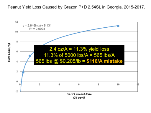% of Labeled Rate <BR>(24 oz/A) <BR>Yield Loss (%)<BR>2.4 oz/A = 11.3% yield loss <BR>11.3% of 5000 lbs/A = 565 lbs/A <BR>565 lbs @ $0.205/lb = $116/A mistake<BR>