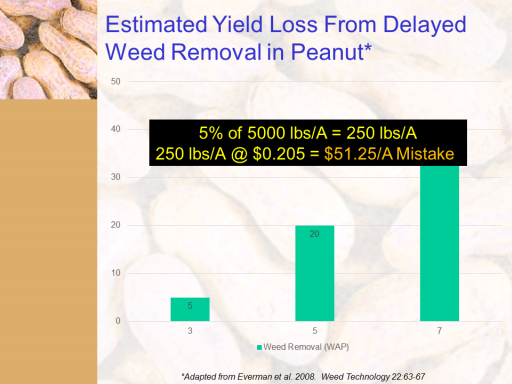 Estimated Yield Loss From Delayed Weed Removal in Peanut*<BR>*Adapted from Everman et al. 2008.  Weed Technology 22:63-67<BR>5% of 5000 lbs/A = 250 lbs/A <BR>250 lbs/A @ $0.205 = $51.25/A Mistake <BR>