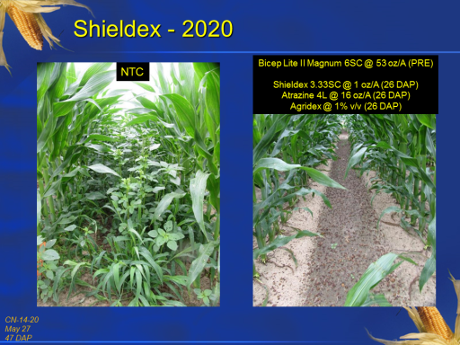Shieldex - 2020<BR>CN-14-20 <BR>May 27 <BR>47 DAP<BR>NTC<BR>Bicep Lite II Magnum 6SC @ 53 oz/A (PRE) <BR> <BR>Shieldex 3.33SC @ 1 oz/A (26 DAP) <BR>Atrazine 4L @ 16 oz/A (26 DAP) <BR>Agridex @ 1% v/v (26 DAP)<BR>