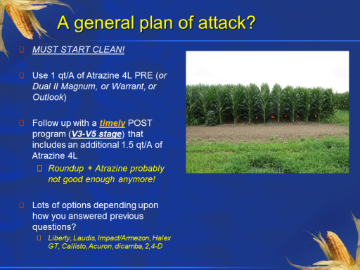 A general plan of attack?<BR>MUST START CLEAN! <BR> <BR>Use 1 qt/A of Atrazine 4L PRE (or Dual II Magnum, or Warrant, or Outlook) <BR> <BR>Follow up with a timely POST program (V3-V5 stage) that includes an additional 1.5 qt/A of Atrazine 4L <BR>Roundup + Atrazine probably not good enough anymore! <BR> <BR>Lots of options depending upon how you answered previous questions? <BR>Liberty, Laudis, Impact/Armezon, Halex GT, Callisto, Acuron, dicamba, 2,4-D<BR>