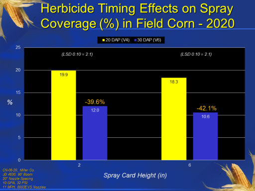 Herbicide Timing Effects on Spray Coverage (%) in Field Corn - 2020<BR>(LSD 0.10 = 2.1)<BR>(LSD 0.10 = 2.1)<BR>CN-06-20, Miller Co. <BR>JD 4630, 90’ Boom <BR>20” Nozzle Spacing <BR>10 GPA, 32 PSI <BR>11 MPH, 8003EVS Nozzles <BR>-39.6%<BR>Spray Card Height (in)<BR>%<BR>