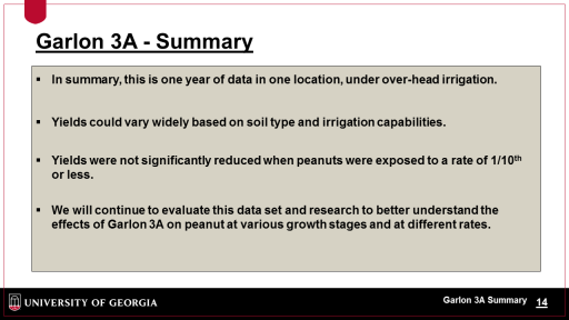 Garlon 3A - Summary<BR>In summary, this is one year of data in one location, under over-head irrigation. <BR> <BR>Yields could vary widely based on soil type and irrigation capabilities. <BR> <BR>Yields were not significantly reduced when peanuts were exposed to a rate of 1/10th or less. <BR> <BR>We will continue to evaluate this data set and research to better understand the effects of Garlon 3A on peanut at various growth stages and at different rates. <BR>Garlon 3A Summary<BR>