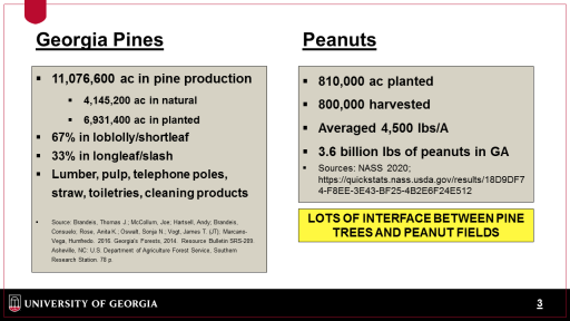 11,076,600 ac in pine production <BR>4,145,200 ac in natural <BR>6,931,400 ac in planted <BR>67% in loblolly/shortleaf <BR>33% in longleaf/slash <BR>Lumber, pulp, telephone poles, straw, toiletries, cleaning products <BR> <BR>Source: Brandeis, Thomas J.; McCollum, Joe; Hartsell, Andy; Brandeis, Consuelo; Rose, Anita K.; Oswalt, Sonja N.; Vogt, James T. (JT); Marcano-Vega, Humfredo. 2016. Georgia's Forests, 2014.  Resource Bulletin SRS-209. Asheville, NC: U.S. Department of Agriculture Forest Service, Southern Research Station. 78 p.<BR>Georgia Pines<BR>810,000 ac planted <BR>800,000 harvested <BR>Averaged 4,500 lbs/A <BR>3.6 billion lbs of peanuts in GA <BR>Sources: NASS 2020; https://quickstats.nass.usda.gov/results/18D9DF74-F8EE-3E43-BF25-4B2E6F24E512<BR>Peanuts<BR>LOTS OF INTERFACE BETWEEN PINE TREES AND PEANUT FIELDS<BR>