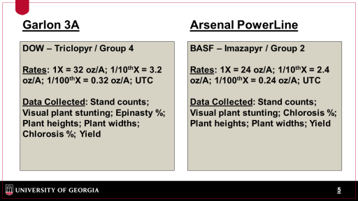 DOW – Triclopyr / Group 4  <BR> <BR>Rates: 1X = 32 oz/A; 1/10thX = 3.2 oz/A; 1/100thX = 0.32 oz/A; UTC <BR> <BR>Data Collected: Stand counts; Visual plant stunting; Epinasty %; Plant heights; Plant widths; Chlorosis %; Yield<BR>Garlon 3A<BR>BASF – Imazapyr / Group 2 <BR> <BR>Rates: 1X = 24 oz/A; 1/10thX = 2.4 oz/A; 1/100thX = 0.24 oz/A; UTC <BR> <BR>Data Collected: Stand counts; Visual plant stunting; Chlorosis %; Plant heights; Plant widths; Yield<BR>Arsenal PowerLine <BR>