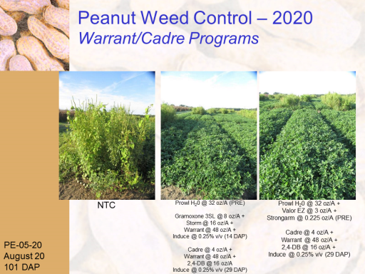 Peanut Weed Control – 2020 Warrant/Cadre Programs<BR>PE-05-20 <BR>August 20 <BR>101 DAP<BR>NTC<BR>Prowl H20 @ 32 oz/A (PRE) <BR> <BR>Gramoxone 3SL @ 8 oz/A + <BR>Storm @ 16 oz/A + <BR>Warrant @ 48 oz/A + <BR>Induce @ 0.25% v/v (14 DAP) <BR> <BR>Cadre @ 4 oz/A + <BR>Warrant @ 48 oz/A + <BR>2,4-DB @ 16 oz/A <BR>Induce @ 0.25% v/v (29 DAP) <BR>Prowl H20 @ 32 oz/A + <BR>Valor EZ @ 3 oz/A + <BR>Strongarm @ 0.225 oz/A (PRE) <BR> <BR>Cadre @ 4 oz/A + <BR>Warrant @ 48 oz/A + <BR>2,4-DB @ 16 oz/A +  <BR>Induce @ 0.25% v/v (29 DAP)<BR>