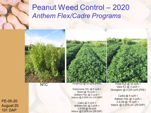Peanut Weed Control – 2020 Anthem Flex/Cadre Programs<BR>PE-05-20 <BR>August 20 <BR>101 DAP<BR>NTC<BR>Prowl H20 @ 32 oz/A (PRE) <BR> <BR>Gramoxone 3SL @ 8 oz/A + <BR>Storm @ 16 oz/A + <BR>Anthem Flex @ 3 oz/A + <BR>Induce @ 0.25% v/v (14 DAP) <BR> <BR>Cadre @ 4 oz/A + <BR>Anthem Flex @ 3 oz/A + <BR>2,4-DB @ 16 oz/A <BR>Induce @ 0.25% v/v (29 DAP) <BR>Prowl H20 @ 32 oz/A + <BR>Valor EZ @ 3 oz/A + <BR>Strongarm @ 0.225 oz/A (PRE) <BR> <BR>Cadre @ 4 oz/A + <BR>Anthem Flex @ 3 oz/A + <BR>2,4-DB @ 16 oz/A +  <BR>Induce @ 0.25% v/v (29 DAP)<BR>
