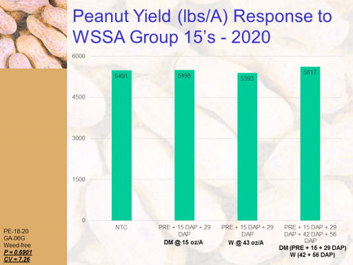 Peanut Yield (lbs/A) Response to WSSA Group 15’s - 2020<BR>PE-18-20 <BR>GA-06G <BR>Weed-free <BR>P = 0.6901 <BR>CV = 7.26<BR>DM @ 15 oz/A<BR>W @ 43 oz/A<BR>DM (PRE + 15 + 29 DAP) <BR>W (42 + 56 DAP)<BR>