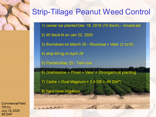 Strip-Tillage Peanut Weed Control<BR>Commercial Field <BR>Tift Co. <BR>July 19, 2020 <BR>56 DAP<BR>1) cereal rye planted Dec 18, 2019 (70 lbs/A) – broadcast <BR> <BR>2) 45 lbs/A N on Jan 22, 2020 <BR> <BR>3) Burndown on March 30 - Roundup + Valor (2 oz/A) <BR> <BR>4) strip-till rig on April 29 <BR> <BR>5) Planted May 25 - Twin row <BR> <BR>6) Gramoxone + Prowl + Valor + Strongarm at planting <BR> <BR>7) Cadre + Dual Magnum + 2,4-DB (~40 DAP)  <BR> <BR>8) hard-hose irrigation<BR>