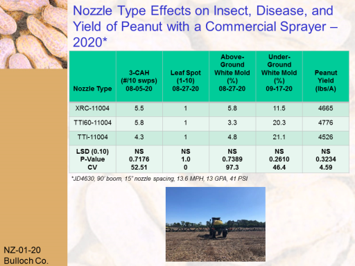 Nozzle Type Effects on Insect, Disease, and Yield of Peanut with a Commercial Sprayer – 2020*<BR>*JD4630, 90’ boom, 15” nozzle spacing, 13.6 MPH, 13 GPA, 41 PSI<BR>NZ-01-20 <BR>Bulloch Co.<BR>