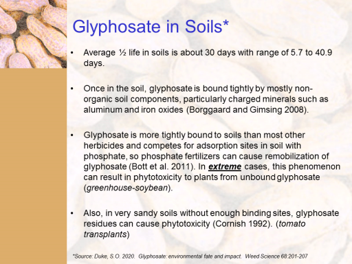 Glyphosate in Soils*<BR>Average ½ life in soils is about 30 days with range of 5.7 to 40.9 days. <BR> <BR>Once in the soil, glyphosate is bound tightly by mostly non-organic soil components, particularly charged minerals such as aluminum and iron oxides (Borggaard and Gimsing 2008).  <BR> <BR>Glyphosate is more tightly bound to soils than most other herbicides and competes for adsorption sites in soil with phosphate, so phosphate fertilizers can cause remobilization of glyphosate (Bott et al. 2011). In extreme cases, this phenomenon can result in phytotoxicity to plants from unbound glyphosate (greenhouse-soybean).  <BR> <BR>Also, in very sandy soils without enough binding sites, glyphosate residues can cause phytotoxicity (Cornish 1992). (tomato transplants)<BR>*Source: Duke, S.O. 2020.  Glyphosate: environmental fate and impact.  Weed Science 68:201-207  <BR>