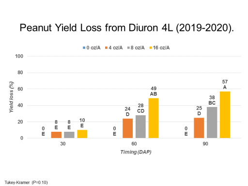 Peanut Yield Loss from Diuron 4L (2019-2020).<BR>Tukey-Kramer (P=0.10)<BR>