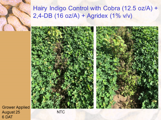 Hairy Indigo Control with Cobra (12.5 oz/A) + 2,4-DB (16 oz/A) + Agridex (1% v/v)<BR>Grower Applied <BR>August 25 <BR>6 DAT<BR>NTC<BR>