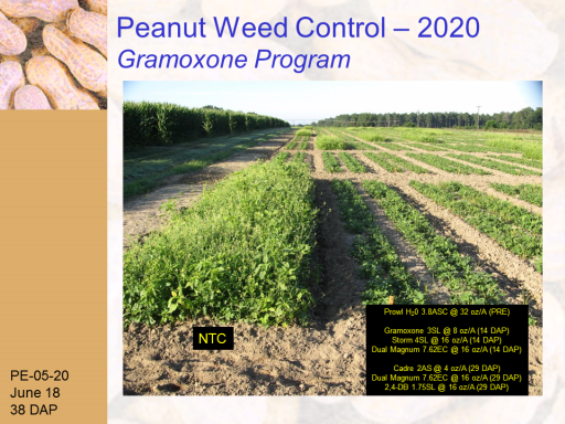 Peanut Weed Control – 2020 Gramoxone Program <BR>PE-05-20 <BR>June 18 <BR>38 DAP<BR>NTC<BR>Prowl H20 3.8ASC @ 32 oz/A (PRE) <BR> <BR>Gramoxone 3SL @ 8 oz/A (14 DAP) <BR>Storm 4SL @ 16 oz/A (14 DAP) <BR>Dual Magnum 7.62EC @ 16 oz/A (14 DAP) <BR> <BR>Cadre 2AS @ 4 oz/A (29 DAP) <BR>Dual Magnum 7.62EC @ 16 oz/A (29 DAP) <BR>2,4-DB 1.75SL @ 16 oz/A (29 DAP)<BR>
