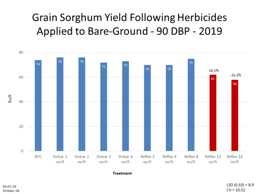 Grain Sorghum Yield Following Herbicides Applied to Bare-Ground - 90 DBP - 2019<BR>Bu/A<BR>Treatment<BR>LSD (0.10) = 8.9 <BR>CV = 10.52<BR>GS-01-19 <BR>October 28<BR>