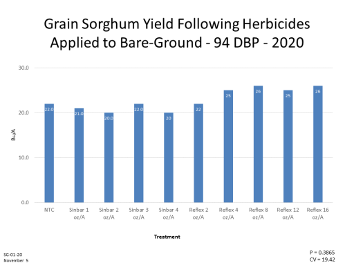 Grain Sorghum Yield Following Herbicides Applied to Bare-Ground - 94 DBP - 2020<BR>Bu/A<BR>Treatment<BR>P = 0.3865 <BR>CV = 19.42<BR>SG-01-20 <BR>November 5<BR>