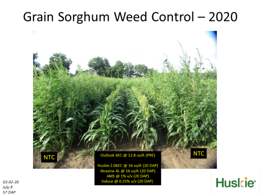 Grain Sorghum Weed Control – 2020<BR>GS-02-20 <BR>July 9 <BR>57 DAP<BR>NTC<BR>Outlook 6EC @ 12.8 oz/A (PRE) <BR> <BR>Huskie 2.06EC @ 16 oz/A (20 DAP) <BR>Atrazine 4L @ 16 oz/A (20 DAP) <BR>AMS @ 1% v/v (20 DAP) <BR>Induce @ 0.25% v/v (20 DAP) <BR>