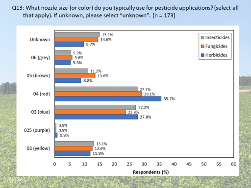 Q13: What nozzle size (or color) do you typically use for pesticide applications? (select all that apply). If unknown, please select “unknown”.  [n = 173]<BR>