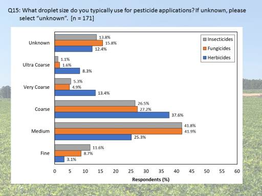 Q15: What droplet size do you typically use for pesticide applications? If unknown, please select “unknown”.  [n = 171]<BR>