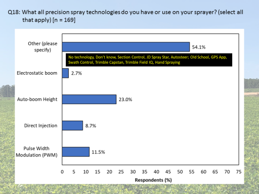 Q18: What all precision spray technologies do you have or use on your sprayer? (select all that apply) [n = 169]<BR>