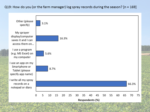 Q19: How do you (or the farm manager) log spray records during the season? [n = 169]<BR>
