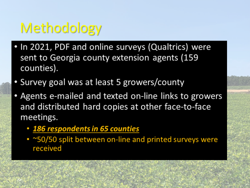 Methodology<BR>In 2021, PDF and online surveys (Qualtrics) were sent to Georgia county extension agents (159 counties). <BR>Survey goal was at least 5 growers/county <BR>Agents e-mailed and texted on-line links to growers and distributed hard copies at other face-to-face meetings. <BR>186 respondents in 65 counties <BR>~50/50 split between on-line and printed surveys were received<BR>