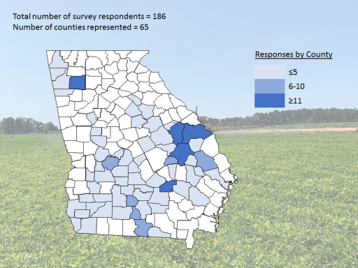 Total number of survey respondents = 186 <BR>Number of counties represented = 65<BR>Responses by County<BR>