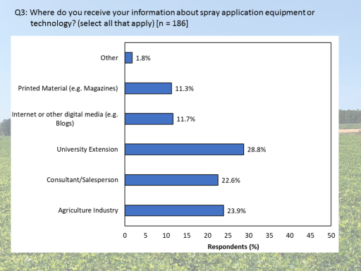 Q3: Where do you receive your information about spray application equipment or technology? (select all that apply) [n = 186]<BR>