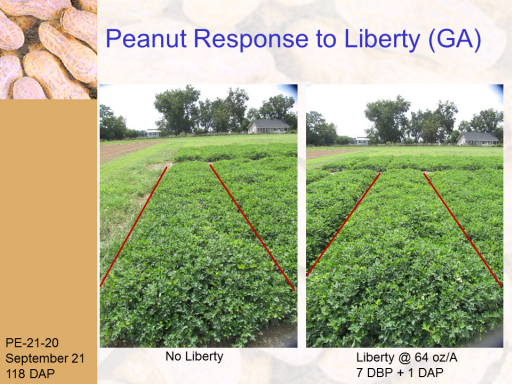 Peanut Response to Liberty (GA)<BR>PE-21-20 <BR>September 21 <BR>118 DAP<BR>No Liberty<BR>Liberty @ 64 oz/A <BR>7 DBP + 1 DAP<BR>