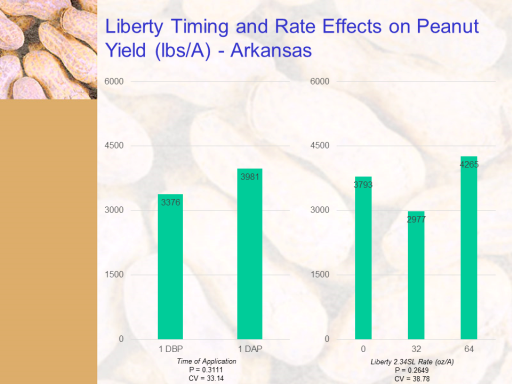 Liberty Timing and Rate Effects on Peanut Yield (lbs/A) - Arkansas<BR>Time of Application <BR>P = 0.3111 <BR>CV = 33.14<BR>Liberty 2.34SL Rate (oz/A) <BR>P = 0.2649 <BR>CV = 38.78<BR>
