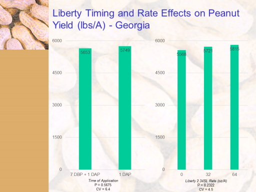 Liberty Timing and Rate Effects on Peanut Yield (lbs/A) - Georgia<BR>Time of Application <BR>P = 0.5675 <BR>CV = 6.4<BR>Liberty 2.34SL Rate (oz/A) <BR>P = 0.2322 <BR>CV = 4.5<BR>