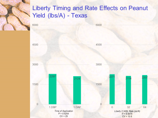 Liberty Timing and Rate Effects on Peanut Yield (lbs/A) - Texas<BR>Time of Application <BR>P = 0.6254 <BR>CV = 29<BR>Liberty 2.34SL Rate (oz/A) <BR>P = 0.8470 <BR>CV = 15.6<BR>