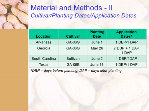 Material and Methods - II Cultivar/Planting Dates/Application Dates<BR>aDBP = days before planting; DAP = days after planting<BR>