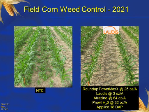 Field Corn Weed Control - 2021<BR>CN-02-21 <BR>May 3 <BR>17 DAT<BR>NTC<BR>Roundup PowerMax3 @ 25 oz/A <BR>Laudis @ 3 oz/A <BR>Atrazine @ 64 oz/A <BR>Prowl H20 @ 32 oz/A <BR>Applied 18 DAP<BR>