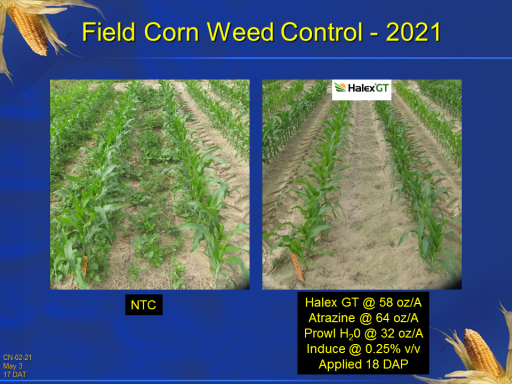 Field Corn Weed Control - 2021<BR>CN-02-21 <BR>May 3 <BR>17 DAT<BR>NTC<BR>Halex GT @ 58 oz/A <BR>Atrazine @ 64 oz/A <BR>Prowl H20 @ 32 oz/A <BR>Induce @ 0.25% v/v <BR>Applied 18 DAP<BR>