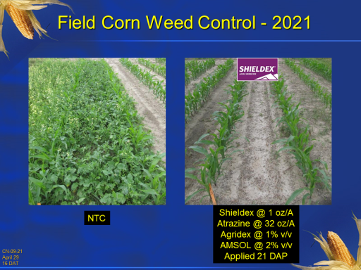 Field Corn Weed Control - 2021<BR>CN-09-21 <BR>April 29 <BR>16 DAT<BR>NTC<BR>Shieldex @ 1 oz/A <BR>Atrazine @ 32 oz/A <BR>Agridex @ 1% v/v <BR>AMSOL @ 2% v/v <BR>Applied 21 DAP<BR>