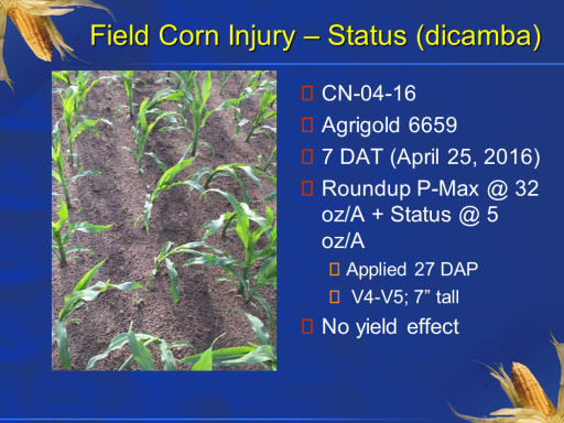 Field Corn Injury – Status (dicamba)<BR>CN-04-16 <BR>Agrigold 6659 <BR>7 DAT (April 25, 2016) <BR>Roundup P-Max @ 32 oz/A + Status @ 5 oz/A <BR>Applied 27 DAP <BR> V4-V5; 7” tall <BR>No yield effect<BR>