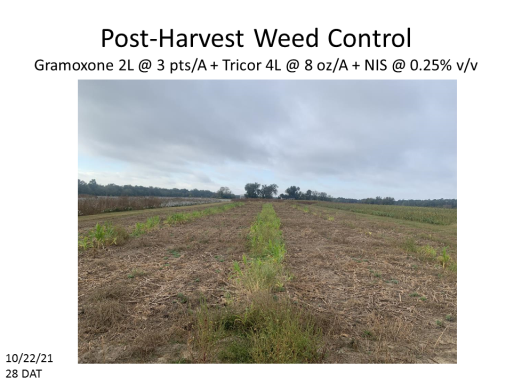Post-Harvest Weed Control Gramoxone 2L @ 3 pts/A + Tricor 4L @ 8 oz/A + NIS @ 0.25% v/v<BR>10/22/21 <BR>28 DAT<BR>