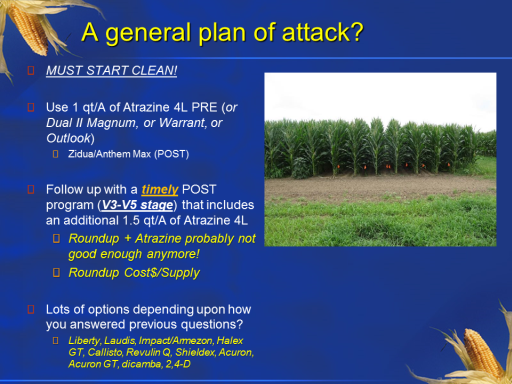A general plan of attack?<BR>MUST START CLEAN! <BR> <BR>Use 1 qt/A of Atrazine 4L PRE (or Dual II Magnum, or Warrant, or Outlook) <BR>Zidua/Anthem Max (POST) <BR> <BR>Follow up with a timely POST program (V3-V5 stage) that includes an additional 1.5 qt/A of Atrazine 4L <BR>Roundup + Atrazine probably not good enough anymore! <BR>Roundup Cost$/Supply <BR> <BR>Lots of options depending upon how you answered previous questions? <BR>Liberty, Laudis, Impact/Armezon, Halex GT, Callisto, Revulin Q, Shieldex, Acuron, Acuron GT, dicamba, 2,4-D<BR>