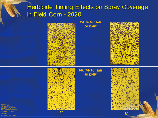 Herbicide Timing Effects on Spray Coverage in Field Corn - 2020<BR>2”<BR>6”<BR>CN-06-20 <BR>JD 4630, 90’ Boom <BR>20” Nozzle Spacing <BR>10 GPA, 32 PSI <BR>11 MPH <BR>8003EVS Nozzles<BR>V4: 9-10” tall <BR>20 DAP<BR>V6: 14-16” tall <BR>30 DAP<BR>