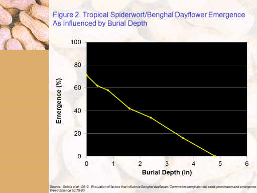 Figure 2. Tropical Spiderwort/Benghal Dayflower Emergence As Influenced by Burial Depth <BR>Source:  Sabila et al.  2012.  Evaluation of factors that influence Benghal dayflower (Commelina benghalensis) seed germination and emergence. <BR>Weed Science 60:75-80.<BR>