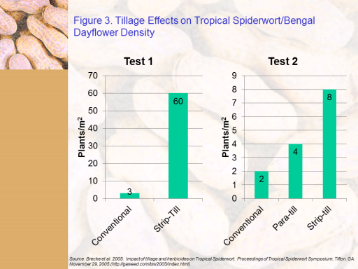 Figure 3. Tillage Effects on Tropical Spiderwort/Bengal Dayflower Density<BR>Source: Brecke et al. 2005.  Impact of tillage and herbicides on Tropical Spiderwort.  Proceedings of Tropical Spiderwort Symposium, Tifton, GA.   <BR>November 29, 2005.(http://gaweed.com/tsw2005/index.html)<BR>