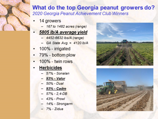 What do the top Georgia peanut growers do? 2020 Georgia Peanut Achievement Club Winners<BR>14 growers <BR>167 to 1482 acres (range) <BR>5805 lb/A average yield <BR>4452-6632 lbs/A (range) <BR>GA State Avg. =  4120 lb/A <BR>100% - irrigated  <BR>79% - bottom plow <BR>100% - twin rows <BR>Herbicides <BR>57% - Sonalan <BR>93% - Valor  <BR>50% - Dual <BR>93% - Cadre <BR>57% - 2,4-DB <BR>43% - Prowl <BR>14% - Strongarm <BR>7% - Zidua  <BR>