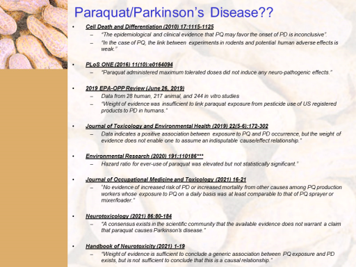 Paraquat/Parkinson’s Disease??<BR>Cell Death and Differentiation (2010) 17:1115-1125 <BR>“The epidemiological and clinical evidence that PQ may favor the onset of PD is inconclusive”. <BR>“In the case of PQ, the link between experiments in rodents and potential human adverse effects is weak.” <BR> <BR>PLoS ONE (2016) 11(10):e0164094 <BR>“Paraquat administered maximum tolerated doses did not induce any neuro-pathogenic effects.” <BR> <BR>2019 EPA-OPP Review (June 26, 2019) <BR>Data from 28 human, 217 animal, and 244 in vitro studies <BR>“Weight of evidence was insufficient to link paraquat exposure from pesticide use of US registered products to PD in humans.” <BR> <BR>Journal of Toxicology and Environmental Health (2019) 22(5-6):172-302 <BR>Data indicates a positive association between exposure to PQ and PD occurrence, but the weight of evidence does not enable one to assume an indisputable cause/effect relationship.” <BR> <BR>Environmental Research (2020) 191:110186*** <BR>Hazard ratio for ever-use of paraquat was elevated but not statistically significant.” <BR> <BR>Journal of Occupational Medicine and Toxicology (2021) 16-21 <BR>“No evidence of increased risk of PD or increased mortality from other causes among PQ production workers whose exposure to PQ on a daily basis was at least comparable to that of PQ sprayer or mixer/loader.”  <BR> <BR>Neurotoxicology (2021) 86:80-184 <BR>“A consensus exists in the scientific community that the available evidence does not warrant a claim that paraquat causes Parkinson’s disease.” <BR> <BR>Handbook of Neurotoxicity (2021) 1-19 <BR>“Weight of evidence is sufficient to conclude a generic association between PQ exposure and PD exists, but is not sufficient to conclude that this is a causal relationship.”<BR>