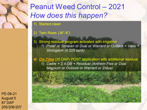 Peanut Weed Control – 2021 How does this happen?<BR>PE-09-21 <BR>August 5 <BR>87 DAP <BR>205/206/207<BR>Started clean <BR> <BR>Twin Rows (36”-9”) <BR> <BR>Strong residual program activated with irrigation <BR>Prowl or Sonalan or Dual or Warrant or Outlook + Valor + Strongarm (0.225 oz/A) <BR> <BR>On-Time (25 DAP) POST application with additional residual <BR>Cadre + 2,4-DB + Residual (Anthem Flex or Dual Magnum or Outlook or Warrant or Zidua)<BR>