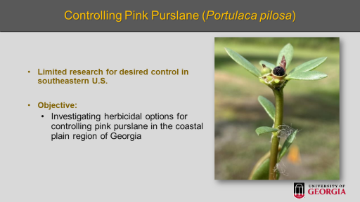 TITLE<BR> <BR> <BR>Limited research for desired control in southeastern U.S. <BR> <BR>Objective:  <BR>Investigating herbicidal options for controlling pink purslane in the coastal plain region of Georgia<BR>Controlling Pink Purslane (Portulaca pilosa)<BR>