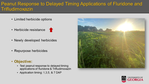 Limited herbicide options <BR> <BR>Herbicide resistance <BR> <BR>Newly developed herbicides <BR> <BR>Repurpose herbicides <BR> <BR>Objective: <BR>Test peanut response to delayed timing applications of fluridone & Trifludimoxazin <BR>Application timing: 1,3,5, & 7 DAP <BR> <BR> <BR>Peanut Response to Delayed Timing Applications of Fluridone and Trifludimoxazin<BR>